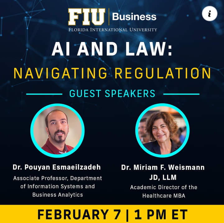 AI and Law: Navigating Regulation is a conversation presented by FIU’s Chapman Graduate School of Business. Hosted by two incredibly talented guest speakers, Dr. Pouyan Esmaeilzadeh and Miriam Weismann will take a deep dive into AI applications across industries, potential benefits, ethical concerns, accountability issues, legal implications, and what we can expect in the future as advancements progress.