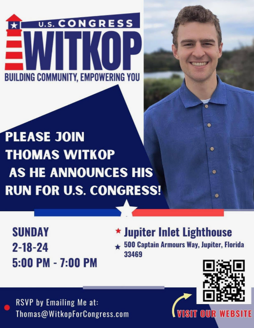 Gen Z candidate Thomas Witkop enters the race to challenge Brian Mast in Congressional district 21! He is extending an invitation to all Democrats in North County to participate in this event. Let’s join him at his campaign kickoff and show this young leader our support.