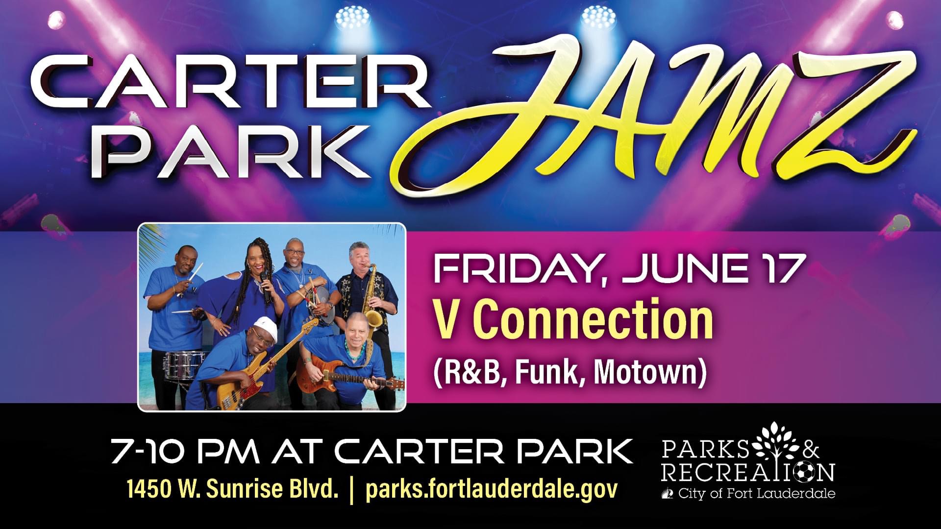 Carter Park Jamz welcomes V Connection (R&B, Funk, Motown) on Friday, June 17. Enjoy a free concert series with a broad range of musical varieties featuring a different live performer each month! Carter Park Jamz takes place on the third Friday of each month from 7 to 10 p.m. at Carter Park. Bring your chairs, picnic blankets, and snacks to relax under the stars. From jazz to pop, Carter Park Jamz has it all!