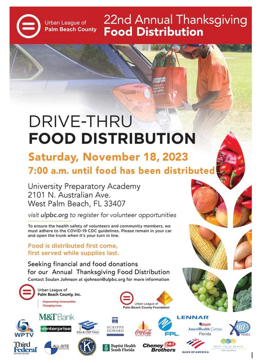 Saturday is our 22nd annual Thanksgiving Food Distribution event in West Palm Beach. We are so grateful to our many wonderful sponsors for supporting this important event and our work in the community.