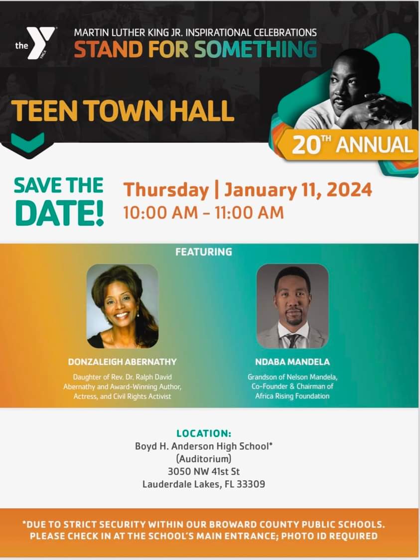 BIG THANK YOU to YMCA”s CEO Sheryl Woods and the entire YMCA of South Florida for selecting Boyd H. Anderson as the Host Site for the 20th Annual Martin Luther King Jr’s Teen Town Hall. DREAMS do come true and our students will hear from pioneers that made the impossible possible. Cobra Nation is on the Move..