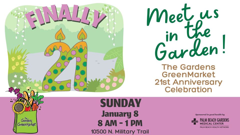 The Gardens GreenMarket is FINALLY turning 21 years old! Meet us in the garden on Sunday, January 8 from 8:00 a.m. to 1:00 p.m. We will have live music by The Phones Quintet, free watermelon koozies & totes while supplies last, and a birdhouse craft activity. Celebrate with us in the special garden tent and enjoy one of our signature adult beverages!