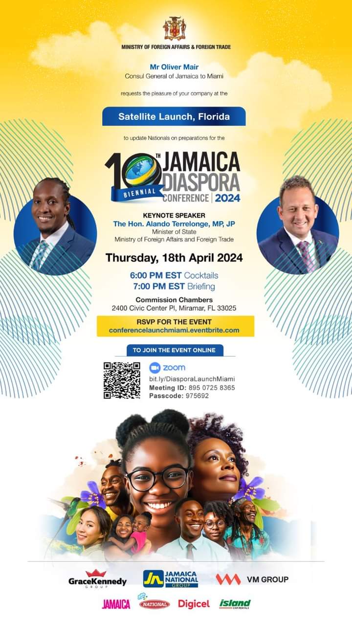 Please join Jamaica’s Consul General, Hon. Oliver Mair for the 10th Biennial Jamaica Diaspora Conference Global Diaspora Satellite Launch at the Miramar Commission Chambers – 2400 Civic Center Place, Miramar. Seating is limited RSVP Today: