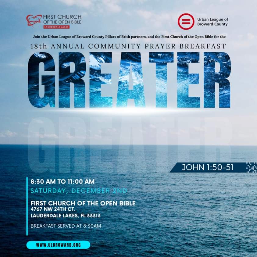 You’re invited to join the Urban League of Broward County and the First Church of the Open Bible as they host the GREATER Prayer Breakfast on December 2nd at 8:30 am.