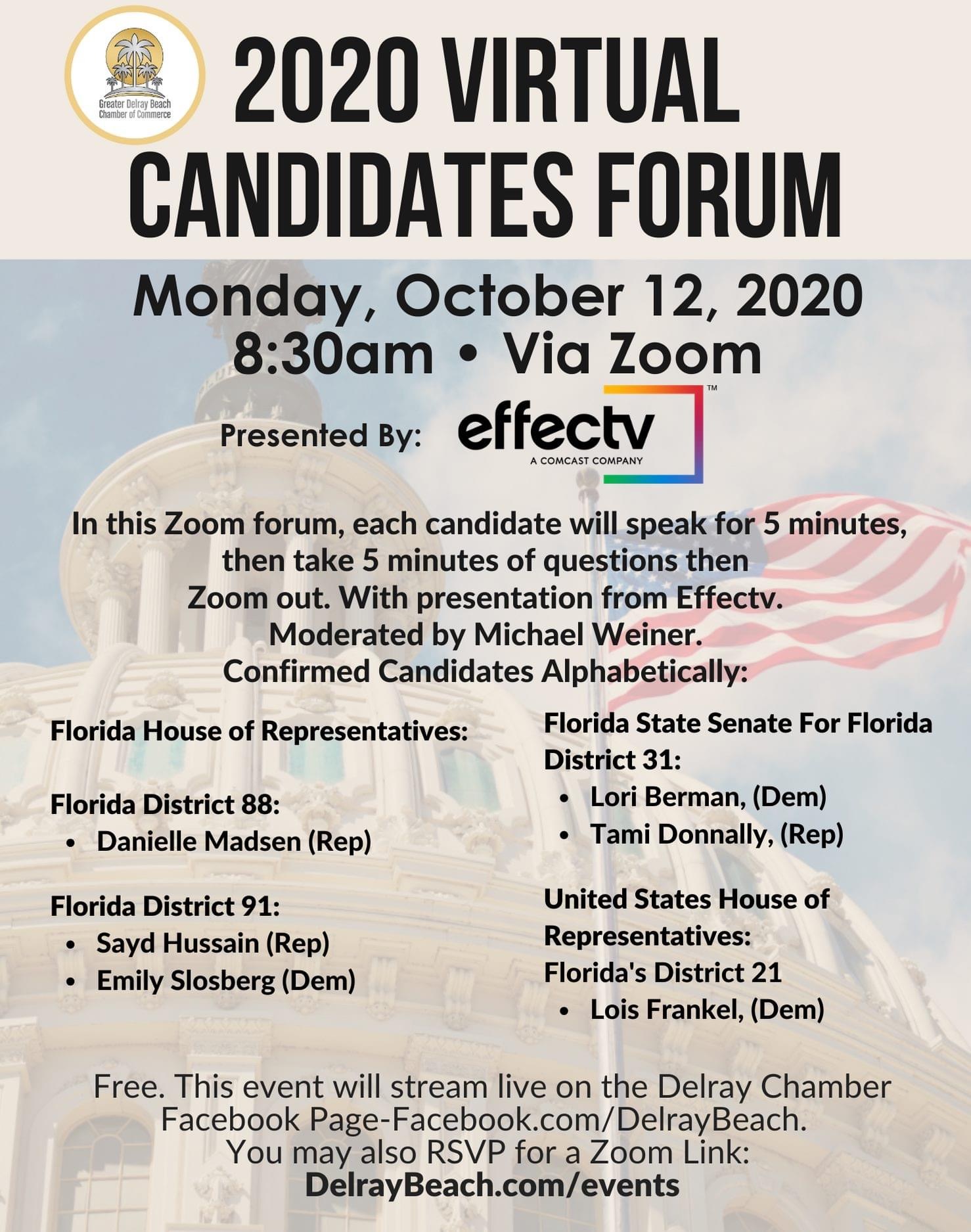 The Greater Delray Beach Chamber of Commerce will host local candidates for Florida Senate and House. You will have the opportunity to hear them speak and ask questions.
