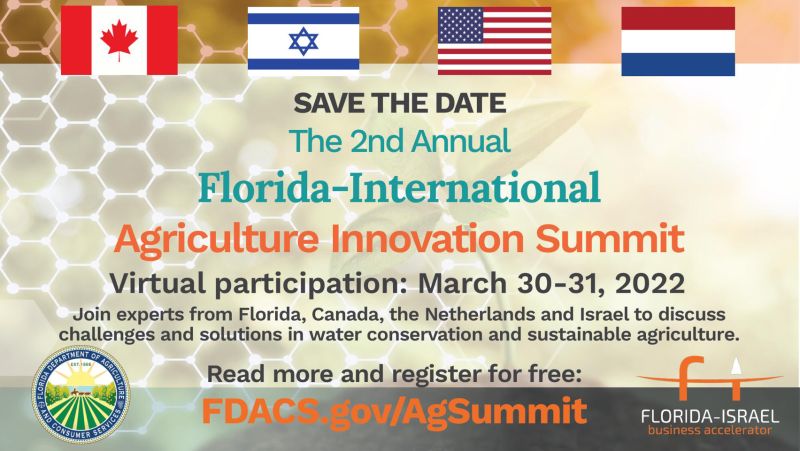 The Florida Department of Agriculture and Consumer Services announced today that our 2022 Florida International Agriculture Innovation Summit, in collaboration with the Florida-Israel Business Accelerator, will take place virtually March 30-31, 2022.