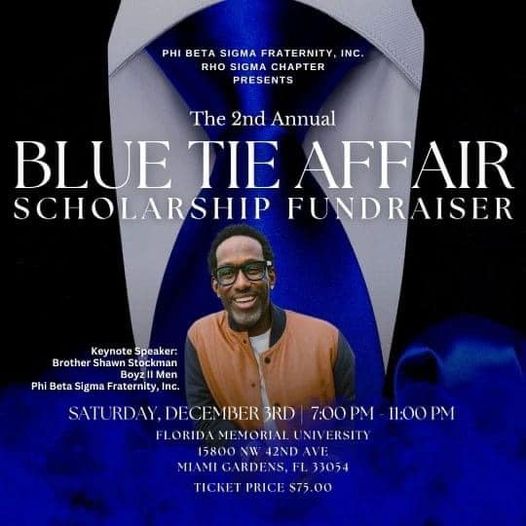 Come out and join the Brothers of the Rho Sigma Chapter for an evening of elegance with our signature 2nd Annual Blue Tie Affair Scholarship Fundraiser on Sat, December 3, 2022, 7:00 PM – 11:00 PM EST at Florida Memorial University 15800 Northwest 42nd Avenue Miami Gardens, FL 33054