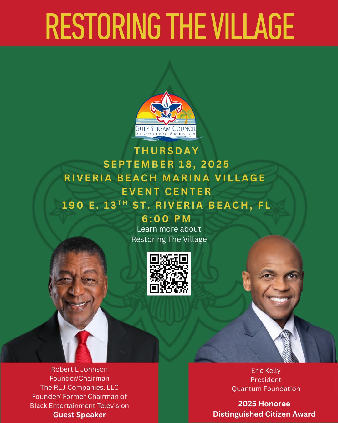 The Gulf Stream Council, Scouting America is proud to present the 2nd Annual Restoring the Village, an evening celebrating leadership, service, and youth empowerment. 🎀 Keynote Guest Speaker: Robert L. Johnson – Founder of BET & Chairman of RLJ Companies πŸ… Honoree – 2025 Distinguished Citizen Award: Eric Kelly – President, Quantum Foundation Your sponsorship and attendance will directly fund Scouting programs that build character, leadership, and opportunity for youth in underserved communities. πŸ“… September 18, 2025 | πŸ•• 6:00 PM πŸ“ Riviera Beach Marina Village Event Center πŸ”— Learn more & get involved: https://lnkd.in/eMfv2nYu