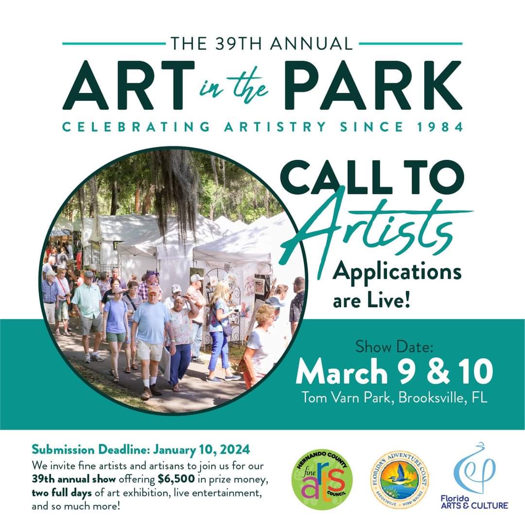 We are still accepting applications for the 39th Annual Art In The Park!! Art In The Park is an annual event that is dedicated to fine art, craftsmanship, and community, coordinated by the Hernando County Arts Council. Join us for Hernando County’s largest juried art show!
