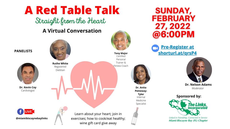 Exactly what is the heart? What are the types, causes, symptoms associated with heart disease? What about treatments? What about prevention? How do I maintain a healthy lifestyle? Am I exercising properly? Am I cooking and eating right? The Miami-Biscayne Bay (FL) Chapter of The Links, Incorporated wants you to stay heart healthy by actively engaging in an interactive “A Red Table Talk: Speaking from the Heart”.