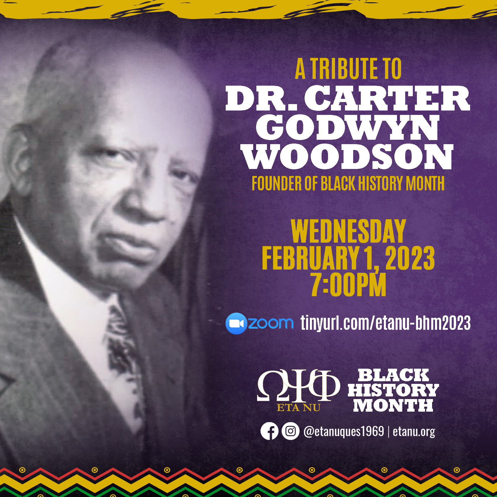 Join the Eta Nu Ques, family and friends for the Black History Month Kickoff with a tribute to the father of Black History Month, the honorable Dr. Carter G. Woodson.