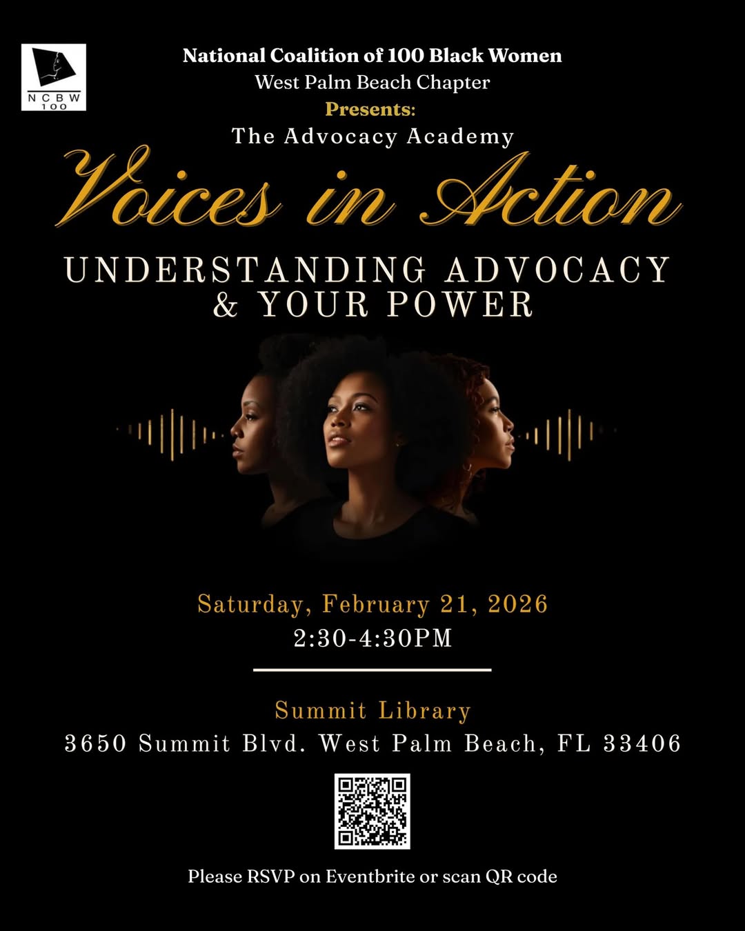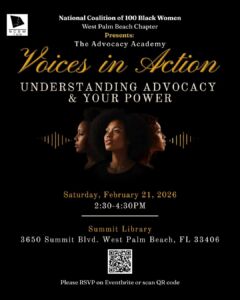 Join the West Palm Beach Chapter of the National Coalition of 100 Black Women for Advocacy Academy: Voices in Action — an interactive 2-part mini-series designed to help women and girls understand advocacy and learn how to engage the systems that impact our communities.