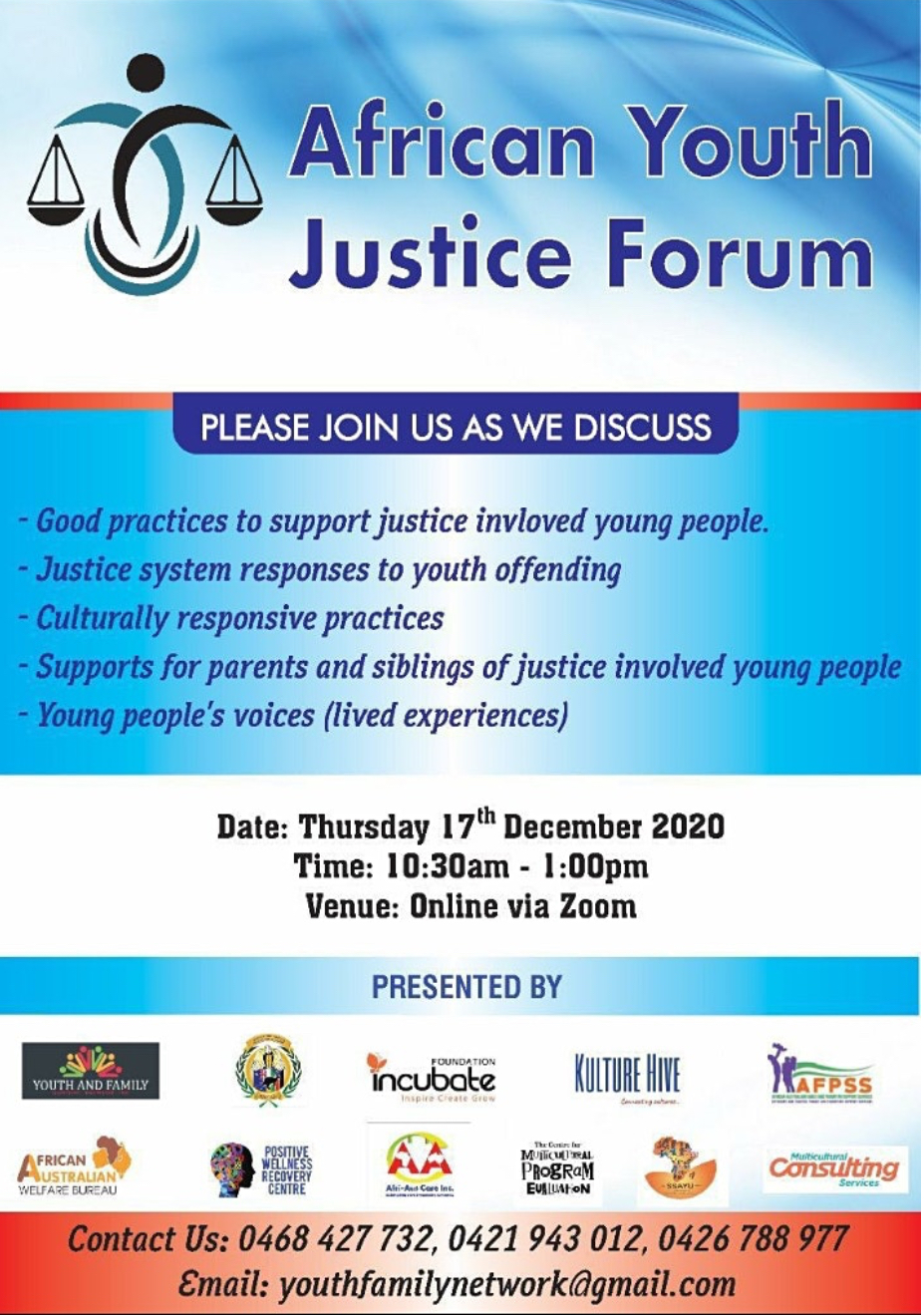 The African youth justice forum brings together community members, leaders, young people, service providers, government officials and professionals working with disadvantaged and justice-involved African-Australian young people.
