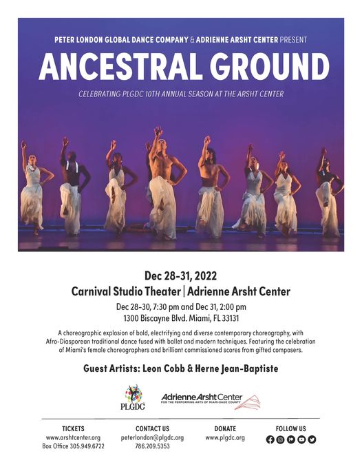 Peter London Global Dance Company 10th Anniversary performance, ‘Ancestral Ground’, opens their run at the Adrienne Arsht Center for the Performing Arts at 730PM.