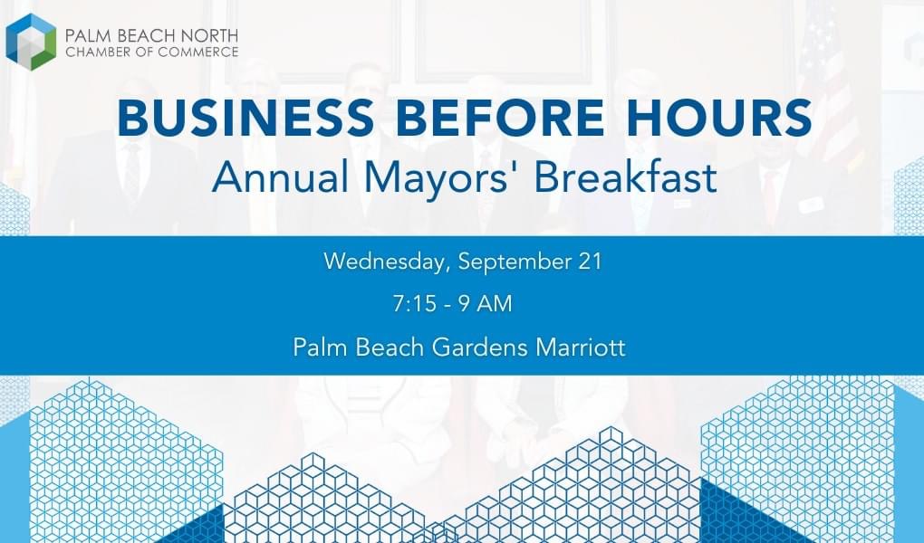 Join the Palm Beach North Chamber of Commerce for our Business Before Hours: Annual Mayors Breakfast on Wednesday, September 21. Each year, we invite the local mayors from Riviera Beach to Tequesta to join us for this popular event. They will share a brief update on what has occurred over the past year and what is to come in the future for their designated municipality.