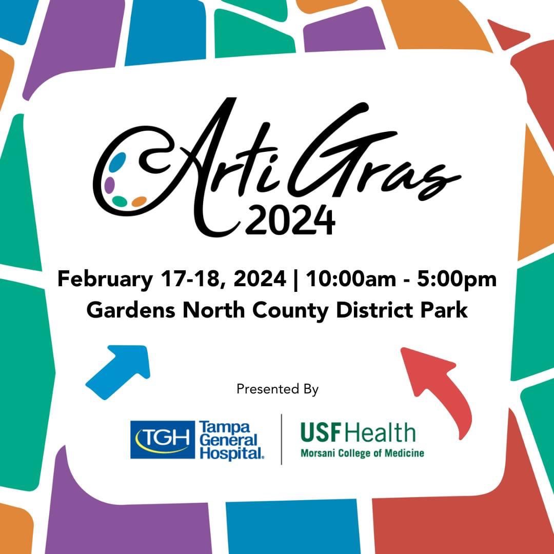 Mark your calendar! ArtiGras Fine Arts Festival, now presented by Tampa General Hospital, is back at Gardens North County District Park President’s Day Weekend 2024 🎨