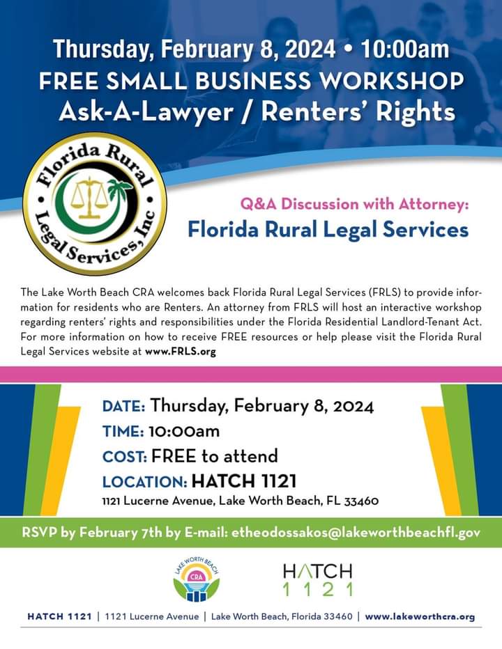 Are you a RENTER in Lake Worth Beach?! The Lake Worth Beach CRA welcomes back Florida Rural Legal Services (FRLS) to provide information for residents who are Renters.