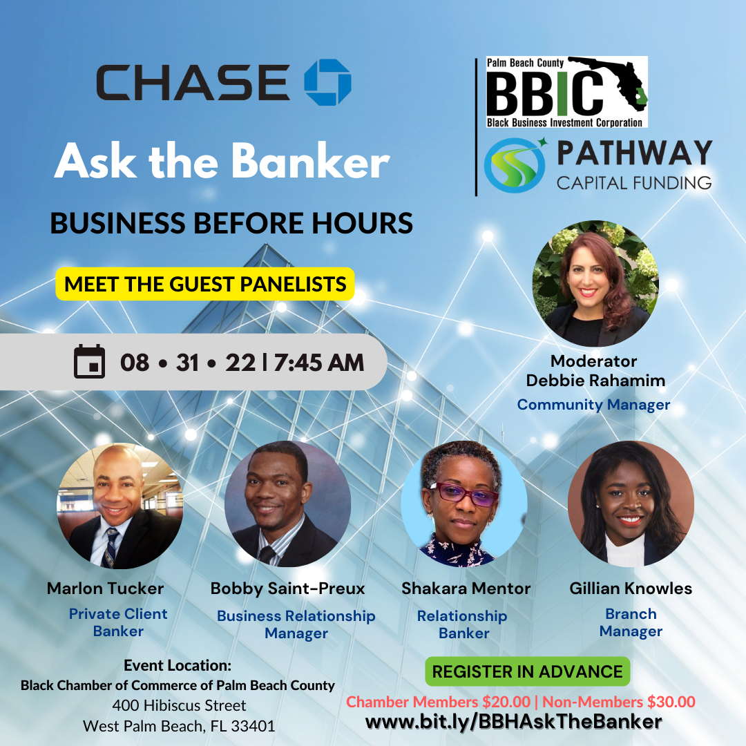 Here’s your opportunity. The ๐๐ฎ๐ฌ๐ข๐ง๐ž๐ฌ๐ฌ ๐๐ž๐Ÿ๐จ๐ซ๐ž ๐‡๐จ๐ฎ๐ซ๐ฌ by Chase Bank, at the Black Chamber of Commerce of Palm Beach County
