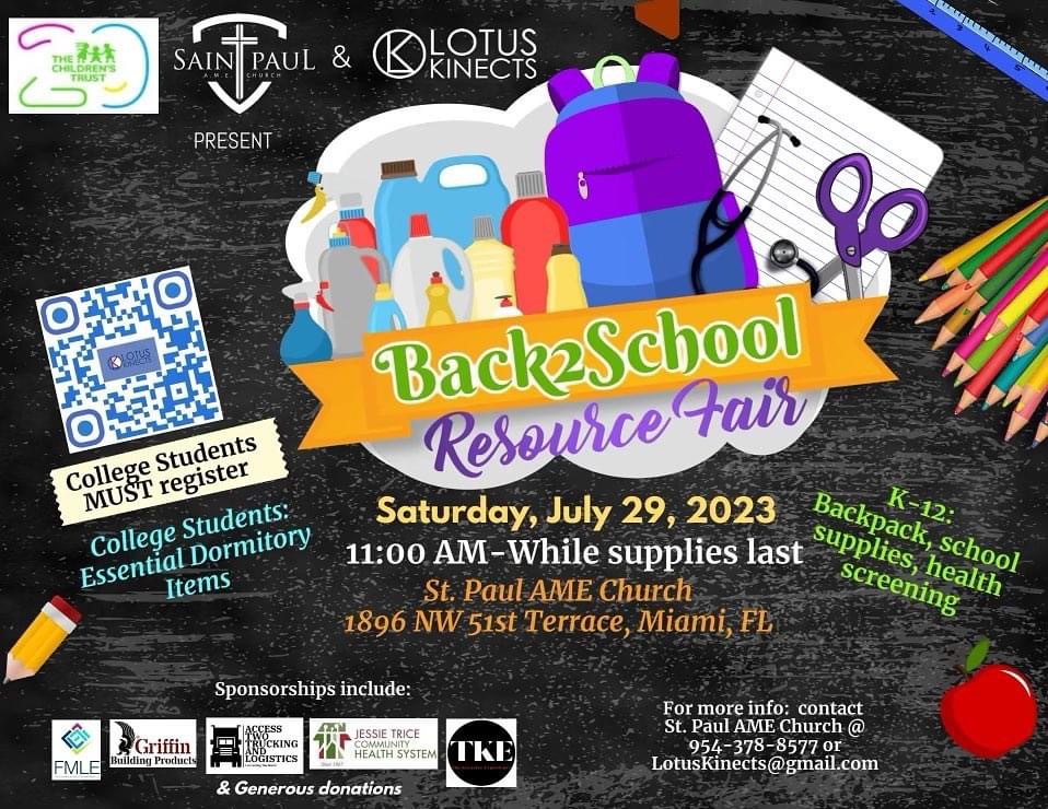 Join us for our Community Back to School Resource Fair, beginning at 11 AM tomorrow. We will have health screening, backpacks, school, supplies, food, a game truck and fun. 1866 NW 51st Terr., Miami, Fl
