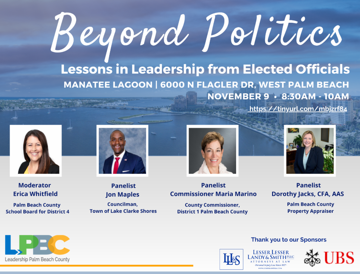 Beyond Politics: Lessons in Leadership from Elected Officials, formerly known as Office Holders Breakfast, is always one of the most insightful events that Leadership Palm Beach County has on its calendar. This event features LPBC Alumni who now hold elective office discussing the leadership lessons learned from being in office as well as their Leadership Palm Beach County experience.