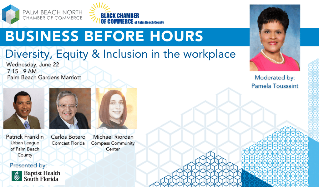 Join the Black Chamber of Commerce of Palm Beach County Palm Beach in partnership with the North Chamber of Commerce for our Business Before Hours paneled discussion on Diversity, Equity & Inclusion in the Workplace. Hear from our panelists: