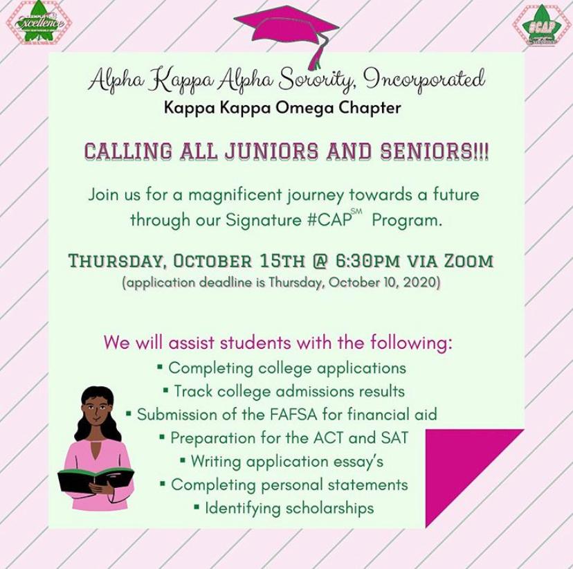 Alpha Kappa Alpha Sorority Inc. the Kappa Kappa Omega Chapter are inviting you to join them for a magnificent journey towards a future through their Signature Cap Program. For more information call Vanessa Bruton 954 849 2281