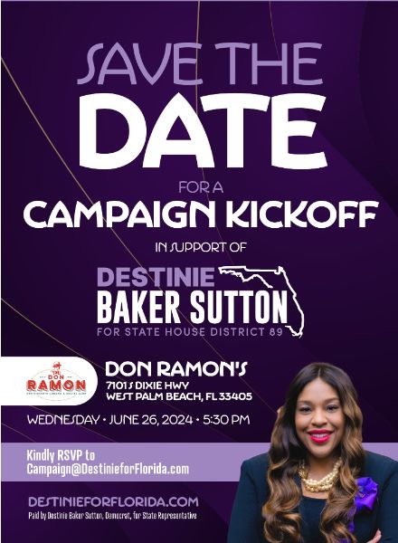 Save the date and join us on Wednesday, June 26th at 5:30 PM at Don Ramon’s in West Palm Beach as we officially kickoff our campaign for State Representative!