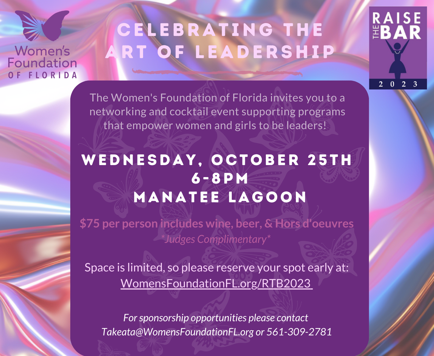 Join us for Raise the Bar, the Women’s Foundation of Florida’s annual fundraiser, on Wednesday, October 25, 2023, from 6 to 8 pm at Manatee Lagoon in West Palm Beach.