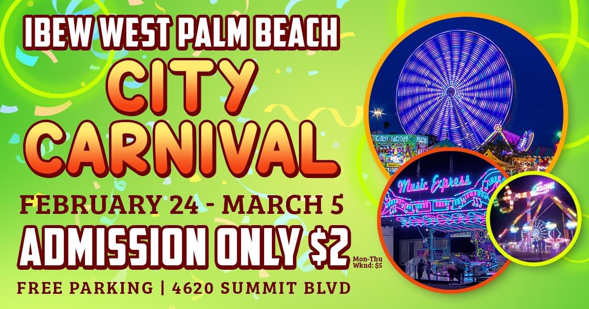 Don’t Miss the West Palm Beach City Carnival going on Friday 2/25-Sun March 25th – Military Trail and Summit – New Rides- thrill rides, kids rides, and the Fair Food you love!
