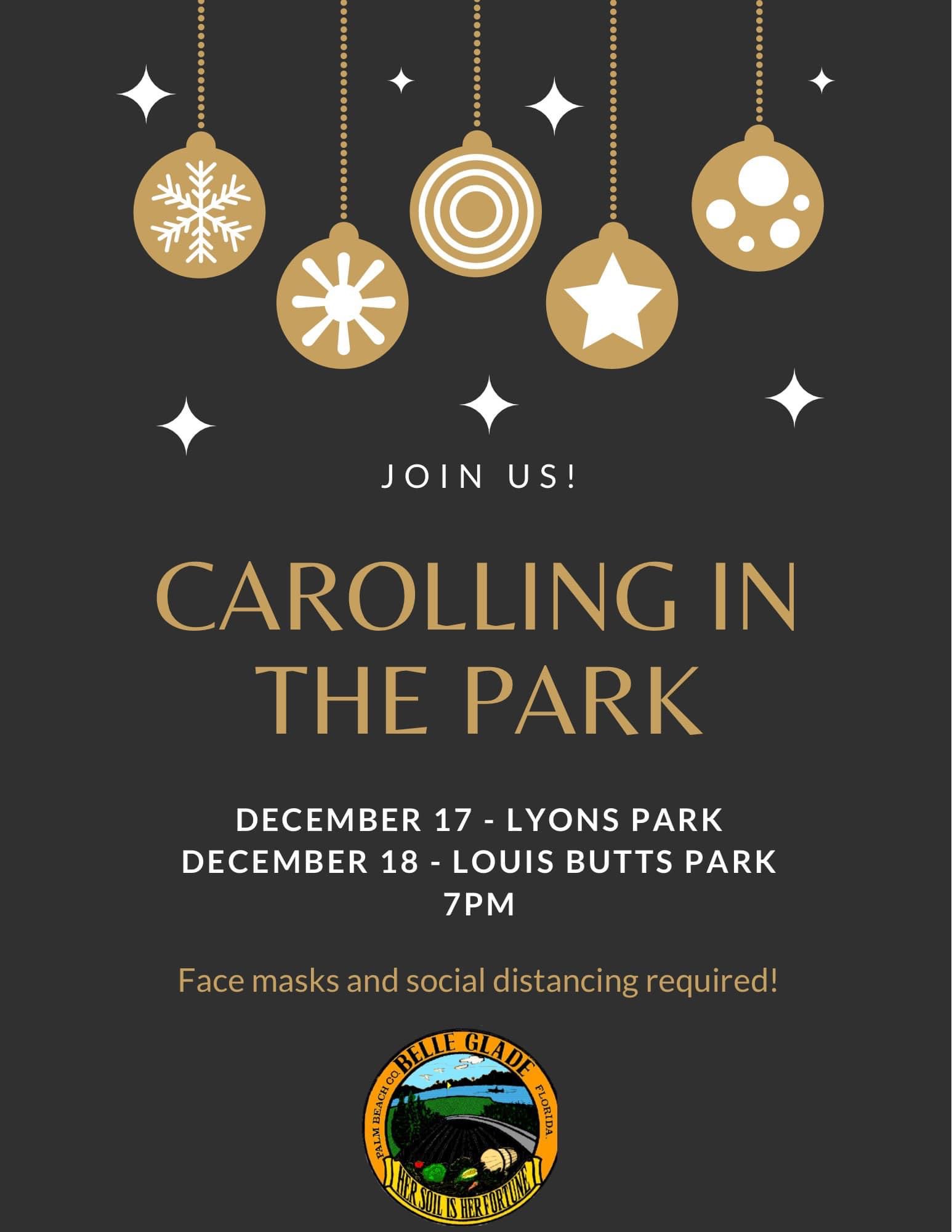 City of Belle Glade Carolling in the Park and lighting of the Christmas display will be held December 17 (Lyons Park) and December 18 (Louis Butts Park) at 7pm. Enjoy as local talent sing songs that usher in the holiday cheer. Masks and social distancing REQUIRED.
