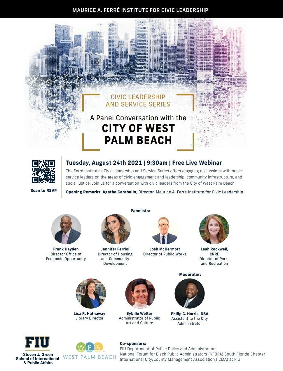 West Palm Beach Mayor Keith A. James invites the public to join the city and Florida International University’s (FIU) Maurice A. Ferré Institute for Civic Leadership for a conversation about civic engagement and leadership, community infrastructure and social justice. This free, live webinar is scheduled for Tuesday, August 24, 2021, 9:30 a.m. Speakers will include: