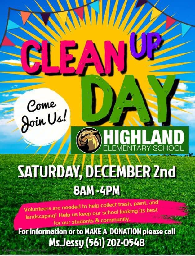 Join us on Saturday December 2, 2023 for Highland Elementary’s beautification day! (Bring shovels if you have them) RSVP to Ms. Jessy. Highland Elementary School The School District of Palm Beach County Lake Worth Beach