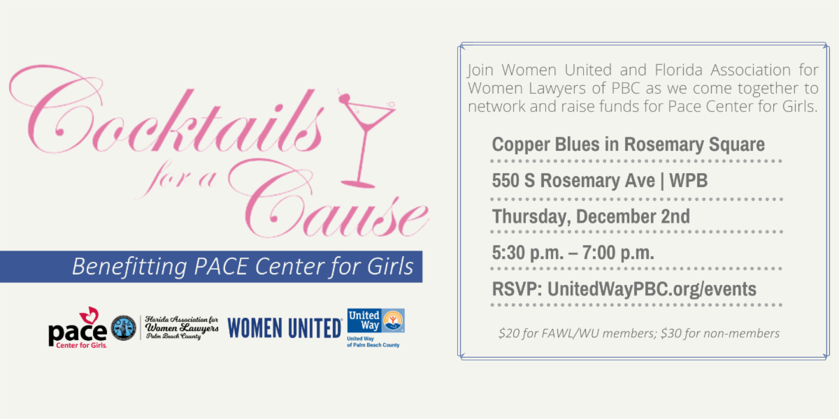 Join Women United and Florida Association for Women Lawyers of PBC for our upcoming Cocktails for a Cause benefitting Pace Center for Girls on December 2nd at 5:30pm. Enjoy a night out at Copper Blues in Rosemary Square as we come together to network and raise funds to support the next generation of female leaders in our community!