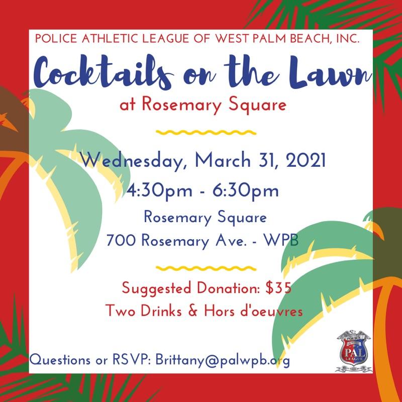 Join us for Cocktails on the Lawn at Rosemary Square. Stop by to learn more about our upcoming events and how you can make a difference in the lives of at-risk youth in downtown West Palm Beach. We will have cocktails, light appetizers, and plenty of conversation. Don’t forget to RSVP and we kindly suggest a $35 donation upon entry. Don’t forget…”Everyone needs a PAL!”
