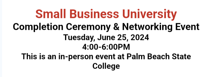Make plans to join us for an afternoon of celebrating and connecting with other small business owners, presenters, and Palm Beach State College professors during our SBU Completion & Networking event.