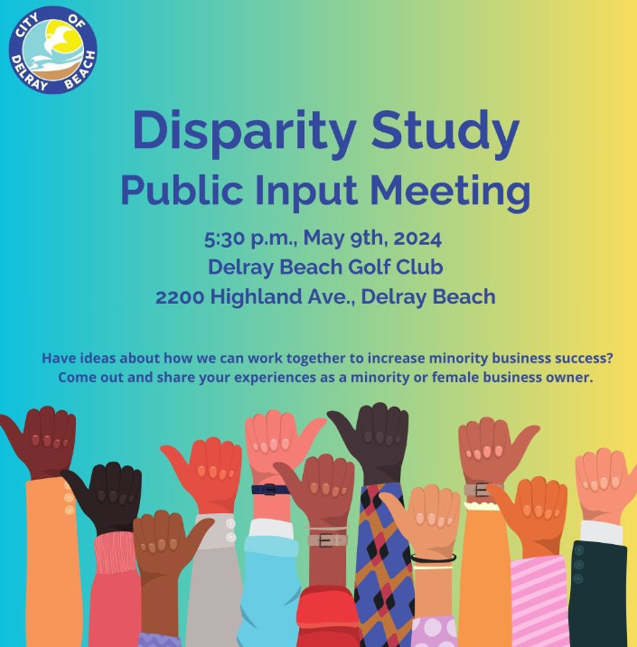 The City of Delray Beach will host a public input meeting regarding its 2024 Disparity Study at 5:30 p.m. on Thursday, May 9, 2024 at the Delray Beach Golf Club located at 2200 Highland Avenue in Delray Beach. All members of the public are invited to participate however, the City is particularly interested in hearing from minority and women-owned businesses at this meeting.