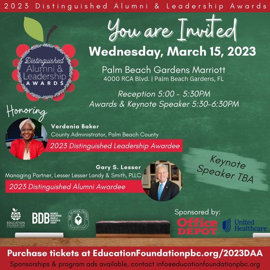 JUST ANNOUNCED: Managing Partner Gary Lesser will be honored with the 2023 Ed Tancer Distinguished Alumni Award by the Business Development Board of Palm Beach County, Education Foundation of Palm Beach County and The School District of Palm Beach County! Gary will be recognized alongside Palm Beach County Administrator Verdenia Baker, recipient of the 2023 Distinguished Leadership Award, at a special reception and ceremony presented by Office Depot on March 15 at the Palm Beach Gardens Marriott.