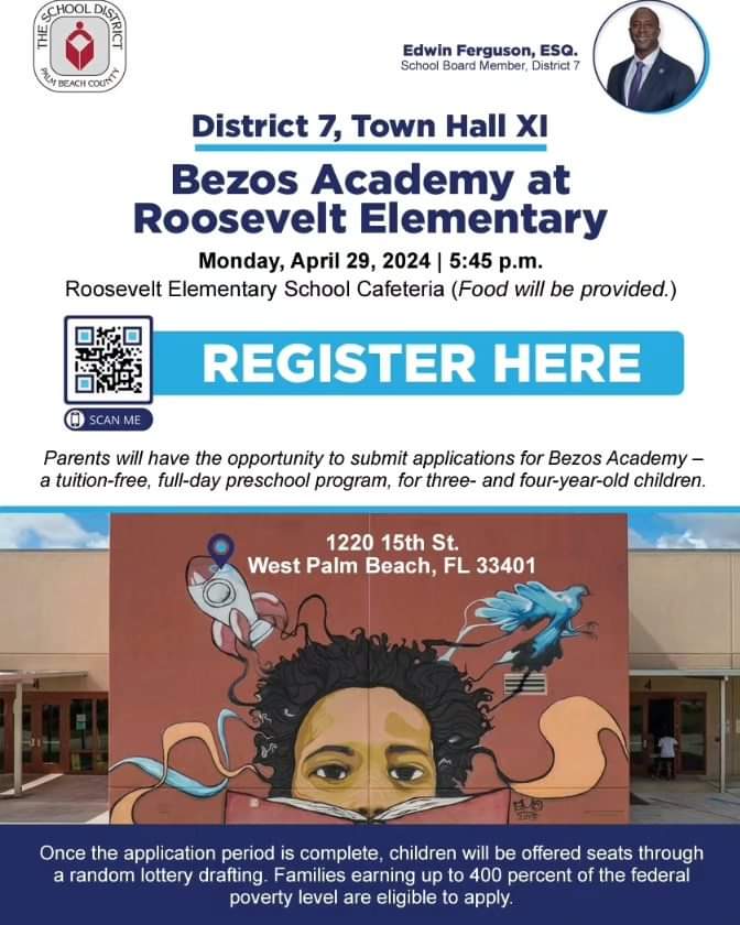 Please join me on Monday, April 29 at 5:45pm to learn about the Bezos Academy’s TUITION FREE FULL DAY preschool program that will be housed at Roosevelt Elementary. I hope to see you there. 👍🏿 #kidsfirst