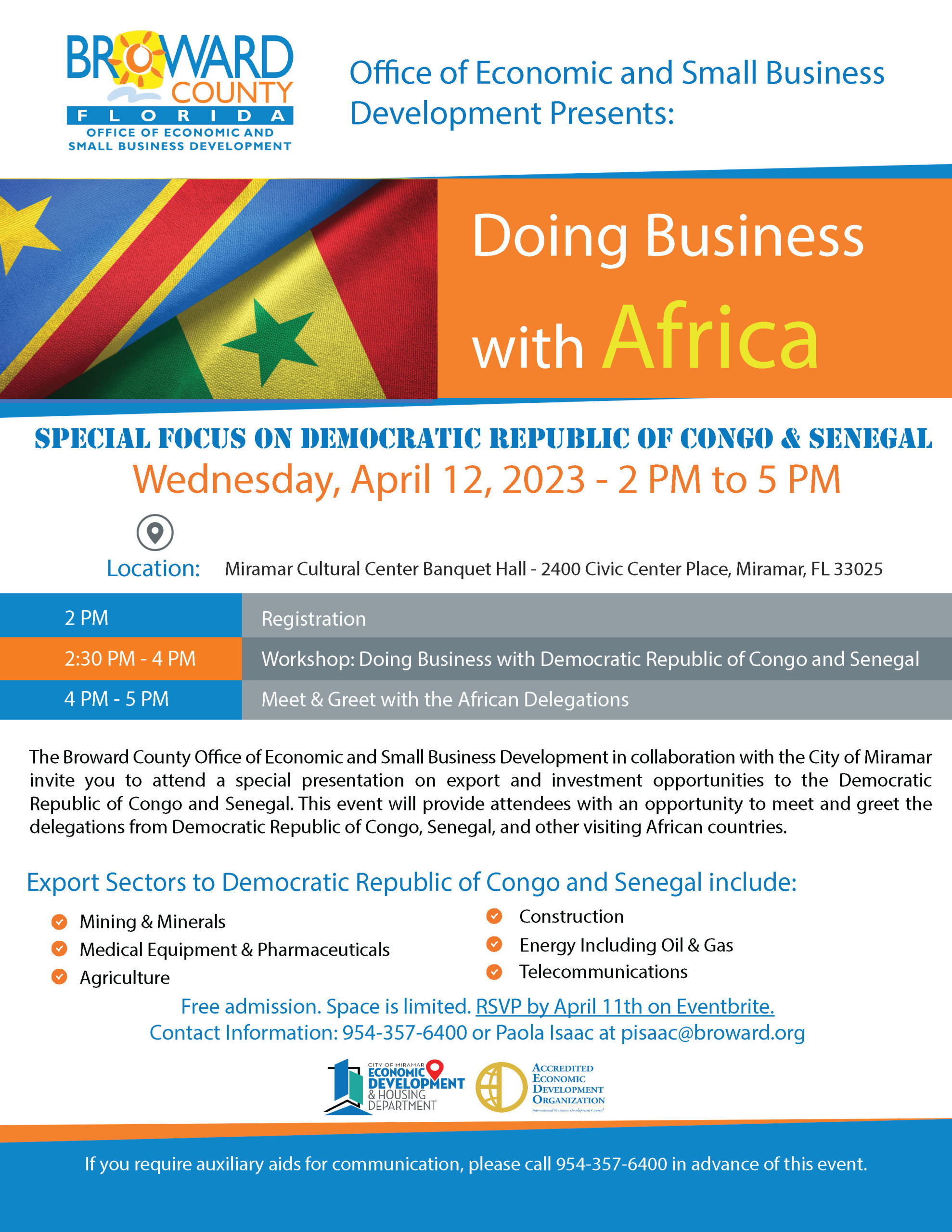 DOING BUSINESS WITH AFRICA – SPECIAL FOCUS ON DEMOCRATIC REPUBLIC OF CONGO & SENEGAL Wednesday, April 12, 2023 – 2 p.m. – 5 p.m.Miramar Cultural Center – Banquet Hall Free workshop on export and investment opportunities to Democratic Republic of Congo and Senegal Export Sectors to Democratic Republic of Congo and Senegal include: