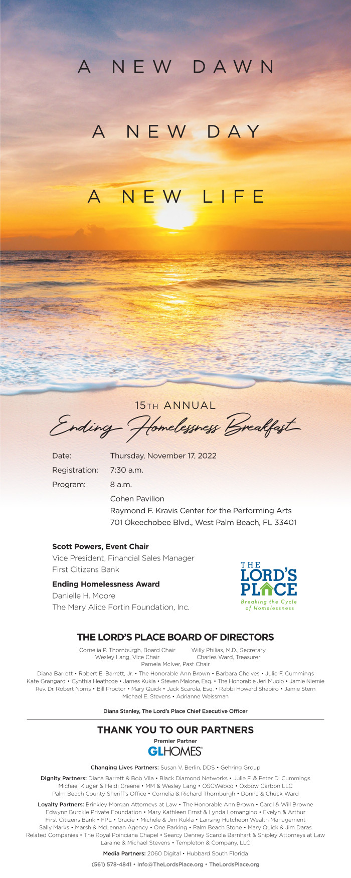 We are so pleased to announce the theme for our 15th Annual Ending Homelessness Breakfast – A New Dawn, a New Day, a New Life! This will be our first post-COVID Breakfast, and we can’t wait to see you all there, in person, to hear powerful stories, moving testimonials, and so much more.