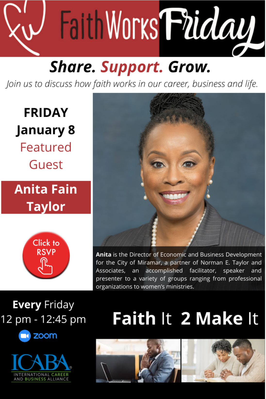 Join the discussion on how faith works in your career, business and life. This Friday the special guest is Anita Fain Taylor the Director of Economic and Business Development for the City of Miramar.