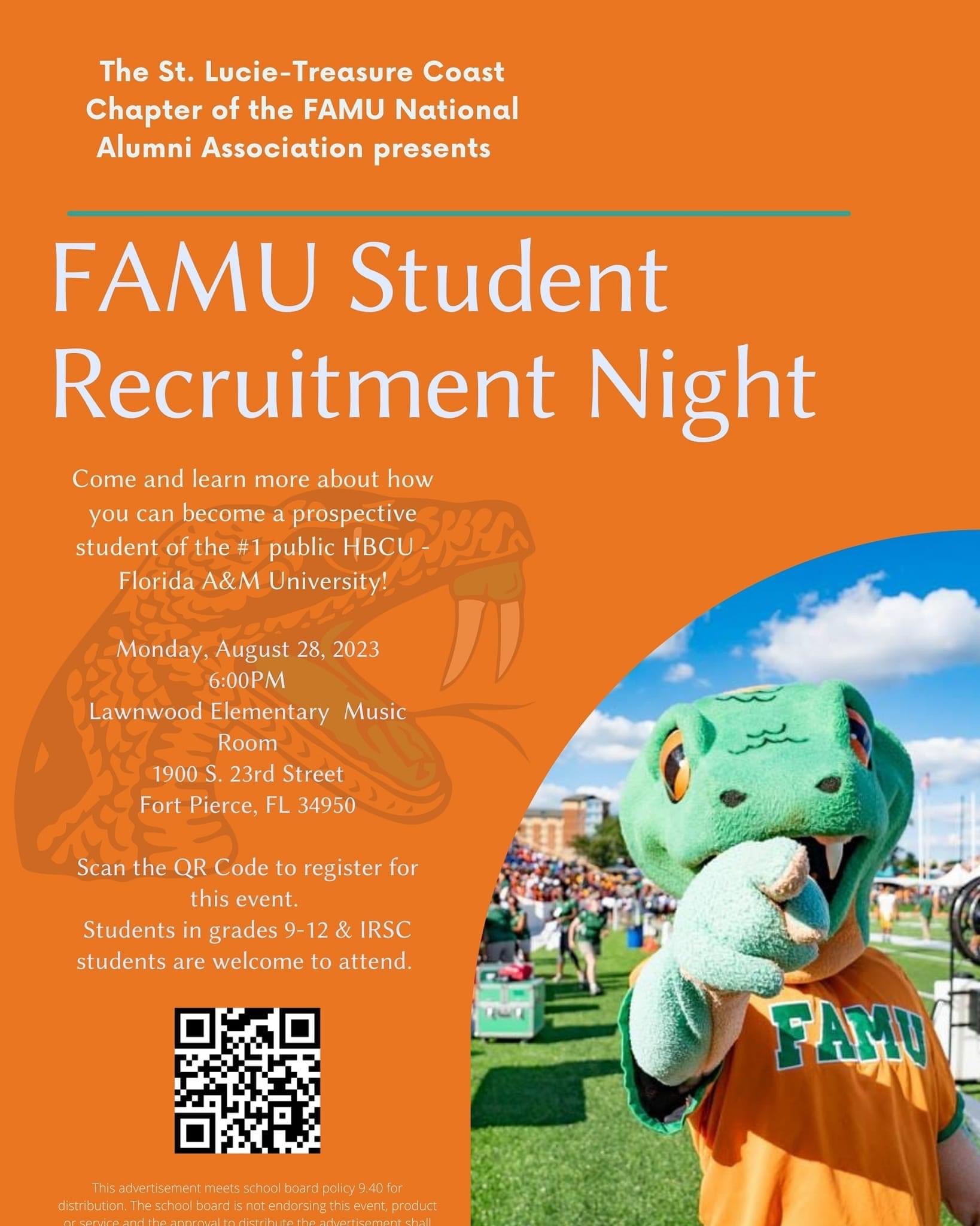 Greetings! The St. Lucie-Treasure Coast Chapter of the FAMU NAA will be hosting its FAMU Student Recruitment Night on Monday, August 28, 2023 at 6:00PM at Lawnwood Elementary School Music Room. Students(Grades 9-12) and parents are welcome to attend and register for this event.