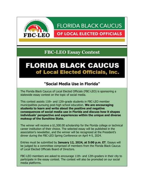 FBC-LEO is calling all 11th and 12th graders to participate in our annual Essay Scholarship Contest. This year’s topic is “Social Media Use in Florida”.