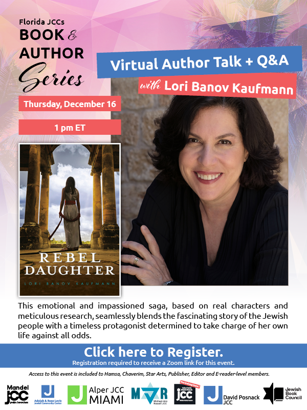 Meanwhile, the growing turmoil threatens to tear apart not only her beloved city, Jerusalem, but also her own family. As the streets turn into a bloody battleground between rebels and Romans, Esther’s journey becomes one of survival. She remains fiercely devoted to her family, and braves famine, siege, and slavery to protect those she loves. This emotional and impassioned saga, based on real characters and meticulous research, seamlessly blends the fascinating story of the Jewish people with a timeless protagonist determined to take charge of her own life against all odds. Before becoming a full-time writer, Lori Banov Kaufmann was a strategy consultant for high-tech companies and served on the boards of several companies. She has an AB from Princeton University and an MBA from the Harvard Business School. She lives in Israel with her husband and four adult children. In partnership with the Florida JCC Consortium.