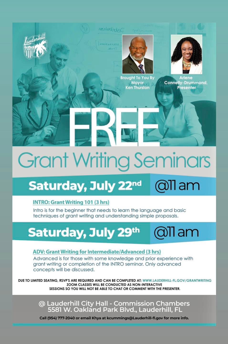 ** Due to limited seating , RSVP’s ARE REQUIRED and can be completed at www.lauderhill-fl.gov/grantwriting . A virtual option is available but will be conducted as non-interactive sessions so you will not be able to chat or comment with the presenter.