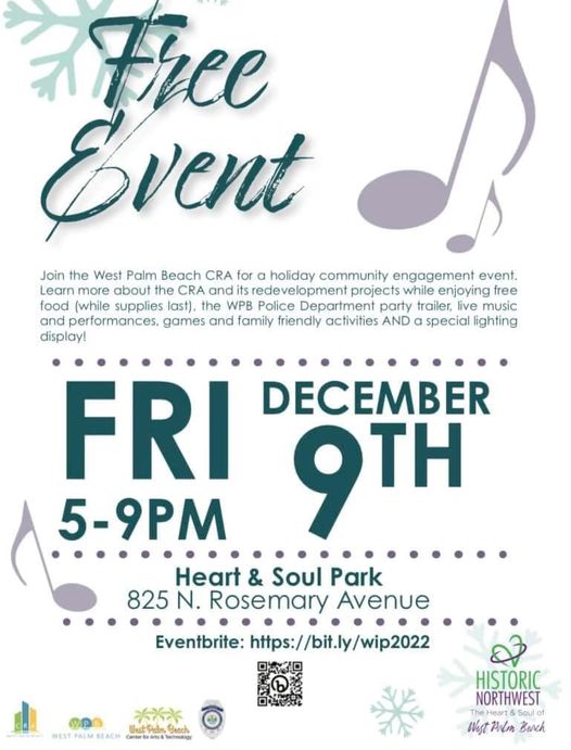 WPBCAT is excited to join the West Palm Beach CRA for their FREE holiday community engagement event on Friday, December 9th at Heart & Soul Park.