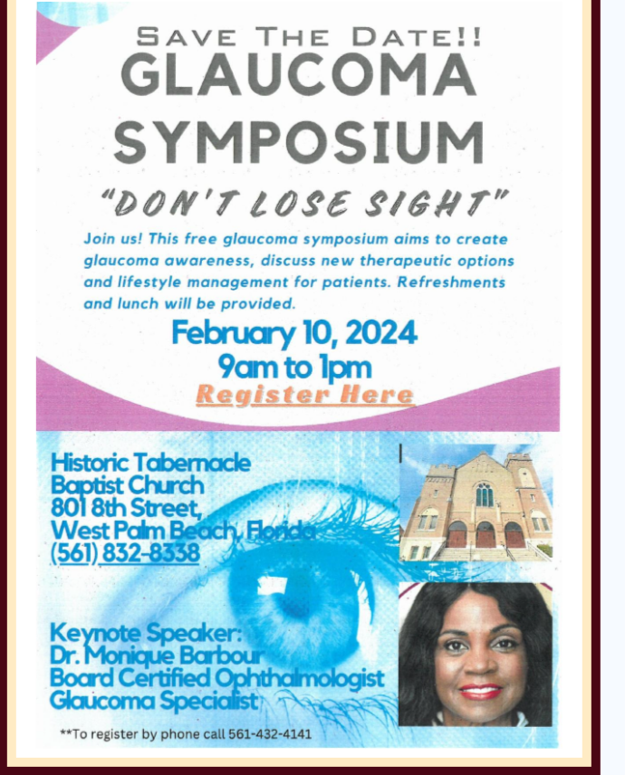 Reminder!! There will be a “FREE” Glaucoma Screening Symposium at Tabernacle this Saturday (2/10) from 9:00a.m.-1:00p.m. – free refreshments provided.