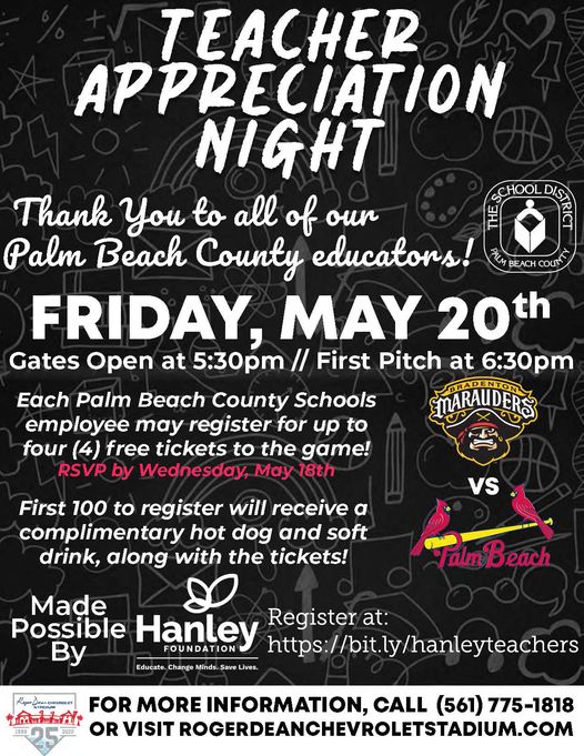 CALLING ALL PBC TEACHERS! We appreciate you! The School District of Palm Beach County employees may register for up to 4 free tickets to the Bradenton Marauders vs the Palm Beach Cardinals game on Friday, May 20th, at Roger Dean Chevrolet Stadium. Tickets are limited, so sign up today!