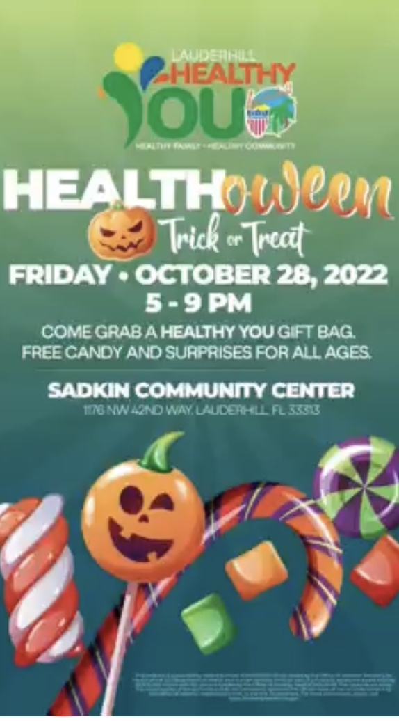This Friday, 10/28, the City of Lauderhill’s Healthy You invites you to “HEALTHoween Trick or Treat” event from 5pm-9pm, at the Sadkins Community Center (1176 NW 42nd Way, Lauderhill, FL 33313). Come enjoy some spooky “Healthy You gift bags,” candy and other surprises throughout the night. The event is FREE and open to the public for all ages. Lauderhill Healthy You City of Lauderhill