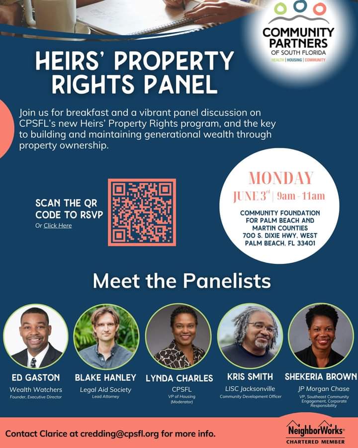 Enjoy a complimentary catered breakfast as we learn about CPSFL’s new Heirs’ Property Rights program, hear from industry professionals, and discuss the key to building and maintaining generational wealth through property ownership.